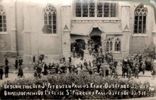 Beschieting der St. Petrus en Pauluskerk Oostende 22/9/17. Bombardement de l'Γ©glise St. Pierre et Paul Ostende 22/9/17. - Beschieting vanuit zee, met zicht op het vernielde noordelijk gelegen zijportaal. -