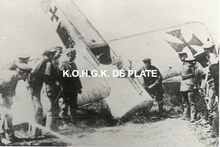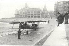 Formaat : 8 x 12 cm. - "Duits militair vliegtuig Albatros D V uit Nieuwmunster die op 29 juli 1917 om 6u40 op het strand voor het Kursaal een noodlanding uitvoerde. Het toestel sloeg overkop waarbij de staart en de propellor beschadigd raakten. Nadien werd de Albatros weer op zijn wielen gezet" In : Vleugels boven Oostende / Walter Major, Norbert Vanthomme. 2009. p.182-183. Plate bib A112. We zien de westgevel van het Derde Kursaal.