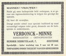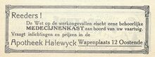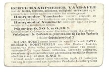 doet de luizen, neetelen, pellekens, vuiligheid verdwijnen. zij is gewaarborgd zonder nadeel en zonder het minste gevaar. Haarpoeder Vandaele zuivert, versterkt en verschoont het haar der kinderen en der groote menschen. Haarpoeder Vandaele belet het haar der jonge meisjes uit te vallen en te breken. Prijs per doos 0.30 fr. en 0.15 fr. Gebruikwijze. Oplossen in water. Alle uitleggingen in elke doos. Verkrijgbaar te Oostende in groot en klein bij Eugène Vanheste, schilder Godshuizenstraat 3. Gij die hoest neemt ineens de wereldberoemde Zwitsersche Borstperels van den Doktoor Carlls, secreet van eenen ouden geneesheer aangenaam van smaak, onovertreffelijk tegen hoest, influenza, slepende vallingen, zwaarborstigheid, schuifelende ademhaling, moeilijke fluimen, slechten slaap, de doos 1.12 fr. Overal zonder onkost 't huis verzonden tegen 13 postzegels van 0.10 fr. opgestuurd aan Apotheker Vandaele, Ledeberg-Gent