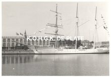 Formaat : 7 x 10,5 cm. Het zeil- en schoolschip Mercator in het tweede handelsdok. Op de achtergrond het stadhuis.