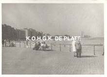 Foto : 18 x 13 cm. De prinses in gezelschap van Marie-Jozef Porta, gemeenteraadslid en vice-consul van Denemarken, op wandel op de Albert I-promenade nabij "Petit Nice" aan het Casino-Kursaal.