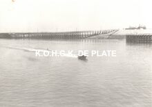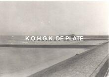 Formaat : 7 x 10,5 cm. Waterskiën in de havengeul. Zicht op het ooststaketsel.