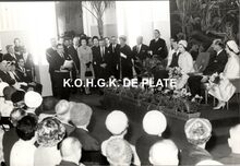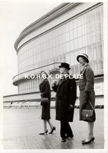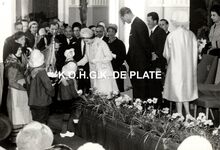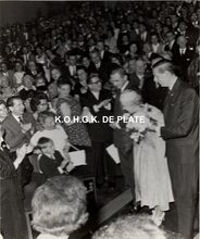 Formaat : 24 x 18 cm. - Koningin Elisabeth aan de arm van burgemeester Jan Piers, rechts, en provinciegouverneur Pierre van Outryve d'Ydewalle naar aanleiding van het Mozartconcert door het Belgisch Kamerorkest. Links, achter de dame in het wit, Florimond Corsellis, dirigent van de stadsharmonie.