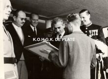 Foto : 13 x 18 cm. Kunstschilder André Sorel schenkt een kunstwerk aan Mohammad Reza Pahlavi, sjah van Iran. Hier aan de ingang van het Casino-Kursaal. We herkennen o.a. : Rechts, burgemeester Jan Piers en tweede van links, Roger De Ramée, concessionnaris van het Casino-Kursaal.