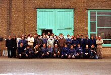 Afdruk, formaat : 29.5 x 21 cm. Personeel Werkhuis "Elektriekers". Foto genomen ter gelegenheid van de pensionering van de heer Mesdagh André