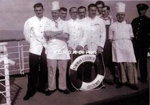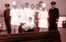 Afdruk, formaat : : 29.5 x 21 cm. - Personeel van de catering aan boord van de pakketboot "Prince Charles". Zesde persoon van rechts, Remi Pyson