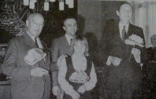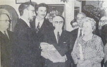 Afdruk, formaat : 29.5 x 21 cm. -Feest in het Werkhuis "Elektriekers", want de heer Mesdagh André gaat met pensioen.