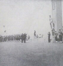 Foto (kopie), formaat : 29.5 x 21 cm. - Koning Albert I en de prinsen op de gangway van een pakketboot