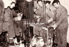 Afdruk, formaat : 29.5 x 21 cm. In de machinekamer, derde van links, officier werktuigkundige Vandevelde L. en rechts naast hem kwartiermeester De Puydt R.