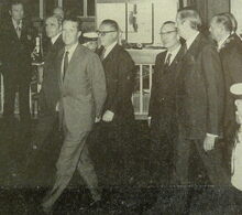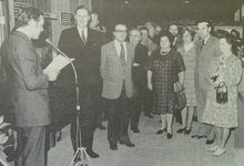 4 foto's : (1) Koning Boudewijn wordt begroet door staatssecretaris Olivier en (2) de koning in gezelschap van burgemeester Jan Piers, Guy Descamps, voorzitter en AdhΓ©mar GΓ©rard gewezen voorzitter van de Rotary Club Oostende.