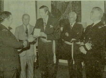 3 foto's : (1) Plechtige ontvangst op het stadhuis. DaniΓ«l Geluyckens krijgt uit handen van burgemeester Jan Piers het ereplakket van de Stad Oostende. Ook aanwezig : Edouard Poskin en de schepenen Kamiel Dehouck en Louis Vanhoorne ; (2) Commodore Edouard Poskin en (3) kapitein ter zee DaniΓ«l Geluyckens