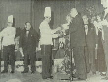 Foto : De winnaar Jean Desmet uit Brussel "Beste Kok van BelgiΓ« 1974", ontvangt de prijs uit de handen van Roger De RamΓ©e, directeur Casino-Kursaal. Recept : Wild konijn