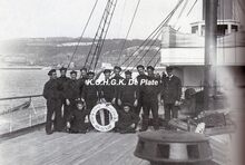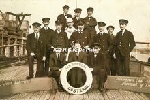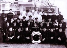 Afdruk, formaat : 29.5 x 21 cm. - Met commandant Deketelaere. Bovenste rij : derde persoon van links, steward, George Van Wulpen. Rij er onder : vijfde persoon van links, met bril, steward, Ernest Callebou. Zittend in de rij van de officieren : tweede persoon van rechts, marconist, Richard Dasseville (gegevens van Arne Pyson)