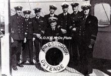 Afdruk, formaat : 29.5 x 21 cm. - Vooraan, staande, de commandanten Walter Defloor en Roland Bedert. Uiterst rechts, chief-steward, A. Brys
