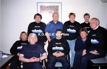 Afdruk, formaat : 29.5 x 21 cm. - Feest aan boord van de carferry "Prins Filip" .Commandandt G. Holthof gaat op pensioen in 1995. Staande, van links naar rechts : 2de persoon Goethaels A , 4de persoon De La Rue P. , 6de persoon Ramakers J. , 7de persoon Vanagt R. , 9de persoon Deklerk N.. Zittend : Heyndrichx L. en commandantdt Holthof.
