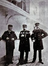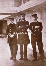 Afdruk, formaat : 29,5 x 21 cm. - Officieren van de pakketboot "Leopold II". Links, luitenant G. Coucke, in het midden, commandant H. Borgers, en rechts, luitenant G. Lambert.