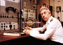 Afdruk, formaat : 29.5 x 21 cm. Eerste marconist Vanblaere Marcel in zijn radiostation O R A H.