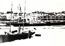 Afdruk, formaat : 17.5 x 12.5 cm. -Β Β De raderstoomboot "Prince Baudouin" (1872-1897) gemeerd nabij het eerste Zeestation. Op de achtergrond, de toren van de Sint-Pieterskerk, bijgenaamd "De Peperbusse".