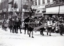 Formaat : 18 x 13 cm. - De stoet ter hoogte van het "Panorama van den Ijzer" langs de Vindictivelaan