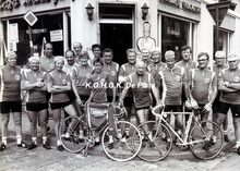 Foto : 17.5 x 12.5 cm. -Β Voor hun lokaal. - "CafΓ© Maes, bij Maurice Maes,Β Nieuwpoortsesteenweg 290. Voor 1993. De man op de tweede rij, niet in wielerkledij is Maurice Maes" (Redgy Hermant)