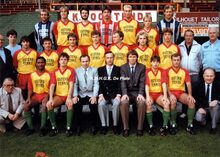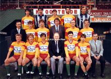 Formaat :Β 17.5 x 12.5 cm. - Voetbalploeg KVOΒ en truienΒ met sponsor restaurant Los Angeles