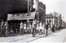 Formaat : 15 x 10 cm. - De Ommegang in de Vlaanderenstraat. Rechts, de hoek met de Van Iseghemlaan