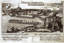 Tropic T 440. - Ostenden in Flandren.Β Afdruk van een kopergravure. Allegorische voorstelling over het beleg van Oostende. We zien de stad vanuit het noorden met rechts de oude haven en links de pas gevormde "Geule" . Op de voorgrond een gewapende krijgsheer die met een spies een klauwende ket (leeuw) onder bedwang houdt.