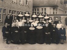 Formaat : 18 x 24 cm. - Orde van Onze Lieve Vrouw Ten Bunderen te Mariakerke, foto werd genomen op 03-07-1946 naar aanleiding van jubileum zuster Clara. In 1989 O.L V College Ten Bunderen, basis onderwijs, Aartshertogstraat 24-26 Mariakerke. Zuster Clara zit op de 1ste rij vierde van links. Op 1ste rij: eerste priester van links is E.H. Georges Borre, tweede priester van links is E.H. deken Joseph Desmet, eerste priester van rechts is E.H. Jacques François. Derde rij: eerste priester van links is E.H. Camiel Forrez, eerste priester van rechts E.H. Valère Adriaens. Vierde rij: eerste priester van links is E.H. André Despriet.