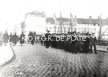 Afdruk, formaat : 19 x 13.5 cm. - Aangemeerd in de haven van Oostende