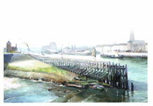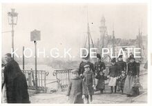 FormaatΒ : 10 x 15 cm. - Vrouwen wandelenΒ met hun kinderen over de brugΒ van de sluisΒ van de handelsdokkenΒ op weg naarΒ het Zeestation. Op de achtergrond, de KeizerskaaiΒ met zichtbaar de toren van het Zeevaartcommissariaat. Links, een gaslantaarn en een verkeersreglementpaalΒ met richtlijnen voor het verkeerΒ over de brug. (Een beeld uit de Belle EpoqueΒ ?) Georges Van Duyvenboden