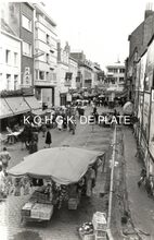 Formaat : 18 x 13 cm. - Links kaashandel "Godelieve", nu (2016) "Kaas Haspeslagh", WittenonnenstraatΒ 29. Verder op de hoek met de LijnbaanstraatΒ cafΓ© "Flying Horse", uitgebaat door Walter Lescrauwaet en Lea Fonteyne, nu "La Siesta", vroeger "'t Vliegend Paard". Aan de overzijde, de winkel met luifelΒ "Boutique Frimousse", Wittenonnenstraat 24/B