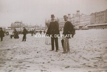 Formaat : 10 x 15 cm. -Β Koning Leopold II Β op het GrootΒ Strand, vergezeld van zijn ordonnans-officier. Op de achtergrondΒ de tweede kursaal. In de achtergrond rechts, de ZeedijkΒ met de grote hotels