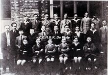 Foto 15 x 10. Vijfde grieks-latijnse van het Koninklijk Atheneum schooljaar 1923-1924. Zittend v.l.n.r.Lambrechts Pieter (werd later rector van de rijksuniversiteit Gent) - Dumont Abel - Debacker Edgard - Debrock Walter - (administrateur-generaal bij het ministerie van nationale opvoeding en cultuur)- pottiez Fernand - Travers Roland. Op de 2de rij Stappers Antoine (studieprefect) - ? - Bottemane Ghislain(muzikant) - Delange Raymond - Maertens Jan (dokter in de geneeskunde)- Simon Marcel (dokter in de geneeskunde) - Deswaef André (zaakvoerder) - Everaerts Pierre - Dejonge - Billiet André. Op de 3de rij Quaghebeur Maurice (notaris)- Piette Fernand (burgerlijk ingenieur)- Moreaux Georges (provinciaal directeur in Congo)- Van Hentenrijck Marcel - Rayée Auguste (aannemer)- Deswaef Willy (zaakvoerder)- Caenen Hubert (apotheker) - Van Bockrijck Paul (handelaar)