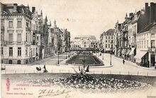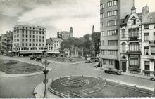 Bazar 10. - Ostende Place Marie-José et Avenue Léopold. De Leopoldlaan, op de hoek met het Marie-Joséplein het Hotel du Parc. Het Marie-Joséplein en het monument ter ere van Auguste Beernaert. Let op de altijd verzorgde bloemenperken door de groendienst van de stad en de sierlijke straatlantaarns. Helaas, na de doortrekking van de Leopoldlaan door het Leopoldpark uit het straatbeeld verdwenen. De Leopoldlaan heet sedert februari 1956 Leopold II-laan