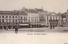 Ostende - La place d'armes. Het Wapenplein, met van links naar rechts : Les Grandes Galeries Belges, The Falstaff, Cercle Coecilia, Hotel restaurant Du Damier en de stadsbibliotheek op de hoek met de Louisastraat
