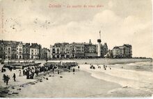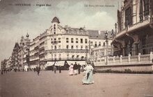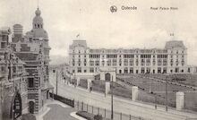 De zeedijk ten oosten van het Kursaal. Op de hoek met de Kursaal-Oosthelling, het Hôtel Royal Belge