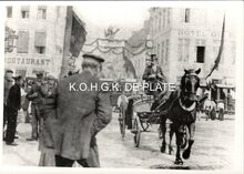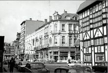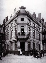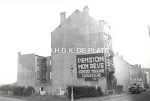 Foto 18 x 13. Van links naar rechts, "AD Delhaize & Cie", "Valentino", "Boulangerie Mécanique" en restaurant, pension, café "Den Hollander". De zaak werd toen uitgebaat door het echtpaar Eugène Hermé en Marie Van Batten. Later zette hun dochter de zaak verder en dit tot in 1973. In 1989 werd het gebouw samen met een aanpalend pand in de Dwarsstraat gesloopt om plaats te maken voor een handels en appartementen gebouw. Het paviljoentje rechts, ontworpen door Alban Chambon, regelt het debiet van het rioolwater.
