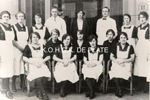 Formaat : 10 x 14 cm. - Personeel van de bierco S.E.O. omstreeks 1925. Op de foto zittend v.l.n.r. Hagers Marie - ? - Esther ? - Maes Madeleine - Arséne ? - ? - Demeulemeester Romanie . Staande Huygebaert Floro - Vincke Marie - Nefors Madeleine - Kamiel? (biertapper) - Marie ? (caissière) - Benonie (biertapper) - Vandenberghe Marguerite - Dejonghe - Ida ?