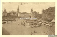 Postkaart. Oostende, Van der Sweepplein of Vandersweepplaats, vanaf 1945 Ernest Feysplein. Een tram van de lijn 2 komt toe uit Westende bad ca. 1924. Motorrijtuig type O.B., met bijrijtuig O.B. en twee open bijrijtuigen waarvan het eerste met afgeronde balkons (reeks: 8760-8767) en het tweede met rechthoekige balkons en omgeslagen rand (reeks 8754-8759). Β De steekkarren voor het tramhuisje waren van de kruiers die de bagage van treinreizigers van of naar de tram of trein brachten. Het station bevond zich toen ook aan het Van der Sweepplein, links van het tramhuisje. Rechtsachter met de twee torentjes, het politiebureau. Midden, Sint Petrus en Pauluskerk Rechts, De Peperbusse, de toen van de door brand vernielde Sint Pieterskerk. Uitgave T.T.O. Noordzee - 1Β° reeks - Oostende