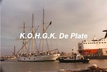 Formaat : 17Β x 17Β cm. - De "Mercator" in het tweede handelsdok met in de achtergrond het stadhuis.