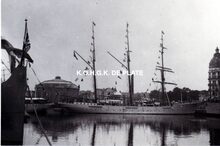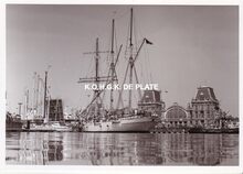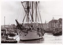 Formaat : 15 x 10 cm.- Het schip lag toen al als museumschip in het tweede handelsdok. Op de achtergrond, het Zeestation
