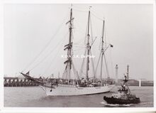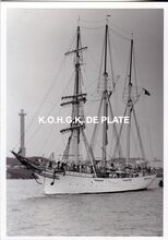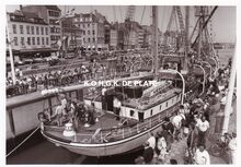 Formaat : 15 x 10 cm. De "Mercator" in de havengeul. Op de achtergrond de vuurtoren "Lange Nelle"