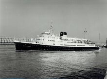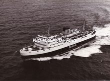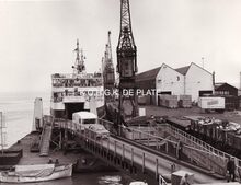Formaat : 22 x 30 cm. - De pakketboot "Koningin Elisabeth" vaart de haven van Oostende binnen. Op de achtergrond het Ooststaketsel. Gebouwd en te water gelaten op de werf "Cockerill-Ougrée" te Hoboken op 29 oktober 1956 en afgeleverd op 8 maart 1957. De meter van het schip was Koningin Elisabeth. Het schip was uitgerust met een kunststof bekleding op de stalen dekken (Dex-o-tex), ter vervanging van hout. Dit om gewichtsbesparingen en omdat houten dekken zeer duur zijn.