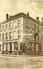Afdruk. - 29 x 19 cm. - "Hôtel de la Gare" was gelegen op de Vandersweepplaats, nu Ernest Feysplein, op de wijk Hazegras. Het werd reeds in 1902 opengehouden door Jerôme Rommelaere-Staelen (zie gevelopschrift). Reclamepanelen voor : (1) Pale Ale. Bass. Stout en (2) Bières. Belgica