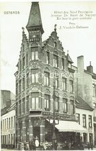 Afdruk. - Formaat : 29 x 19 cm. - Hôtel des Neuf Provinces. Graaf De Smet de Naeyerlaan. En face de la gare. Prop. : Vandale-Deboom. Vooraan : In 1907 werden palen geplaatst met bronzen versieringen op de Vandersweepplaats, de Graaf de Smet de Naeyerlaan en -bruggen om de rijdraden te dragen voor de elektrische tram naar Blankenberge die het jaar daarop zou rijden. Die palen dienden tegelijkertijd voor de elektrische verlichting