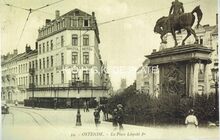 Afdruk, formaat 19 x 29 cm. - Ostende. La place Léopold 1er.Het Leopold I-monument op het Leopold I-plein met links de Van Iseghemlaan en rechtdoor de Karel Janssenslaan. Op de hoek het "Bristol Hotel" met beneden café-restaurant- brasserie. Rechtdoor in de achtergrond zien we de toren van het oude postgebouw, vernield tijdens de Tweede Wereldoorlog. De dubbele tramsporen in de Van Iseghemlaan richting kruispunt Petit Paris, vanaf 1910 tot 1927