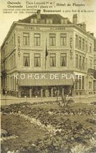 Afdruk. - Formaat : 29 x 19 cm. - . Ostende. Place Léopold Ier et l'Hôtel de Flandre. Oostende. Leopold I plaats en 't Hôtel de Flandre. Renommé pour son excellent restaurant à prix fixe et à la carte. Bekend om zijn uitstekend restaurant met vaste prijzen. Hôtel de Flandre gelegen op de hoek van de Torhoutsesteenweg en de Rogierlaan 1-3 en het Leopold I-plein