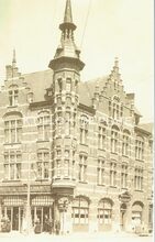 Afdruk. - 29 x 19 cm. - Het "Hôtel de L'Espérence, Oesterbankstraat 4 en hoek Vandersweepplaats, nu Ernest Feysplein. Gebouwd in de periode 1901-1909 naar de plannen van de Oostendse architect Jean-François Gobin. In de neo-Vlaamse renaissance stijl met bruinrode bakstenen uit Zandvoorde. Let op het sierlijke hoekdeel met torentje.