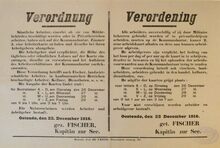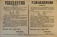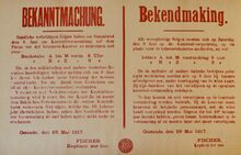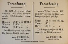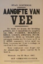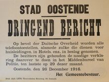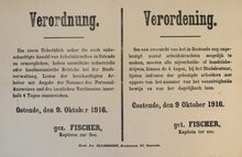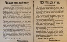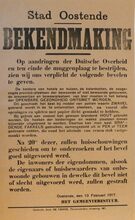 Formaat : 35 x 56 cm. Kennisgeving uitgaande van de Kommandantur Oostende betreffende de onderrichtingen van 9 september 1916 inzake de in- en uitvoer van goederen