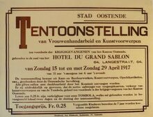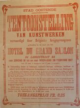 Formaat : 44 x 57 cm. Affiche betreffende een tentoonstelling van vrouwenhandarbeid en kunstvoorwerpen ten voordele van de Krijgsgevangenen van het kanton Oostende